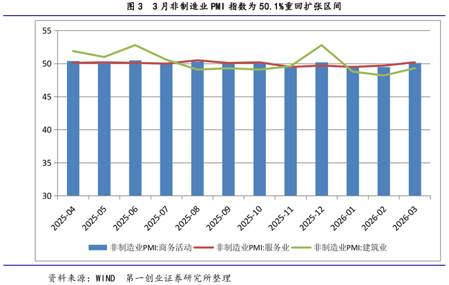 从需求上(图2所示)看,3月新订单为51.6,较上月回升3百分点,回升幅度较大且重新回到扩张区间,表明制造业市场需求明显改善;而3月新出口订单为49.1%,较上月 回升4.1 个百分点。而从进口指数看,3月为49.8%,较上月回升4.2个百分点。可见,3月 PMI 供需双方同时有所回升,且内需强于外需,呈现出供需两旺的总体格局。 另外,3月非制造业PMI指数为50.1%(图 3所示),仅较上月回升0.6个百分点, 重新回到扩张区间。其中,服务业为50.2%,较上月回升0.5个百分点;而建筑业为49.3%, 较上月回升1.1个百分点。 私募投资交流圈招募,深耕策略研究、收益复盘,私信微信 Q8881961