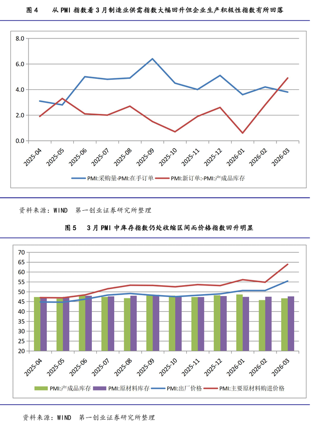 从库存角度看,3月产成品库存指数为46.7%,较上月回升0.9个百分点;而3月原材料库 存指数为47.7%,较上月回升0.2个百分点(图5所示)。3月采购量指数为50.9%,较上月回升2.7个百分点;而从PMI中产成品库存与在手订单之比看,这一代表库存销售比的指数有所 回落,3月为0.99,处于历史较低水平,而2月为1.04,显示去库存较为顺利。从PMI价格指数上看(图5所示),受中东战争的影响,3月出厂价格指数为55.4%,较上月大幅回升4.8个百分点,连续三个月处于50%以上的扩张区间,显示制造业领域通缩有明显好转;主要原材料购进价格为63.9%,较上月大幅回升9.1个百分点,创2022年5月以来的新高。以出厂价格指数减去主要原材料购进价格指数来代表制造业企业利润状态,3月为-8.5%, 较上月回落4.3个百分点,这说明制造业企业利润水平有所回落。
