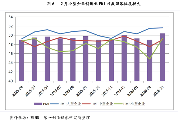 其中,大型企业为51.6%, 较上月回升0.1个百分点;中型企业为49.0%,较上月回升1.5个百分点;小型企业为49.3%,较上月大幅回升4.5个百分点;大型企业与中小型企业的景气度 的分化状态有所收窄。