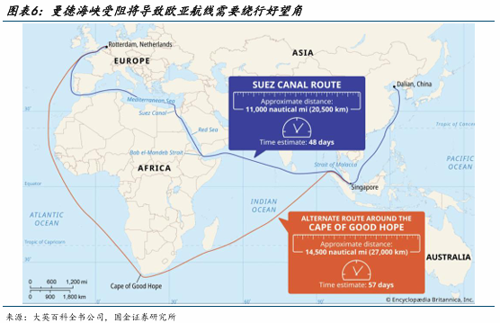 无论是哪种登陆战形式,都有可能触发胡塞武装加入战场。如果胡塞尝试封锁曼德海峡,意味着承载全球12%海运贸 易量、连通欧亚的“亚丁湾-曼德海峡-红海-苏伊士运河-地中海”航路面临阻断风险,航运需要绕行非洲好望角,将进一步推升运价、物价、降低供应链效率。