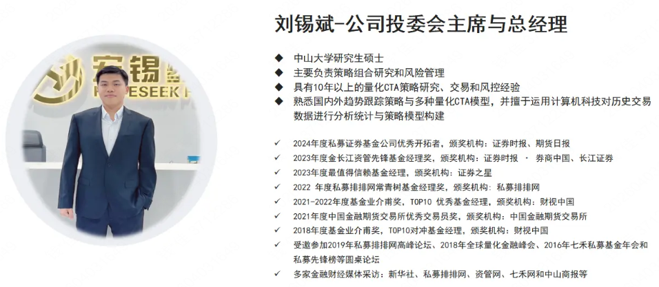 公司团队组建于2010年,大部分来自于国内外知名理工和金融院校。创始人刘锡斌,具有超10年的量化CTA策略研究、交易、风控经验,熟悉国内外趋势跟踪策略与多种量化CTA模型。公司共计24位成员,拥有自主研发的智能交易系统和丰富多元的量化策略体系,获得多家证券公司和期货公司白名单。宏锡基金追求每年绝对收益,公司化运作至今已持续稳健地发展11年,并获得多项行业奖项。