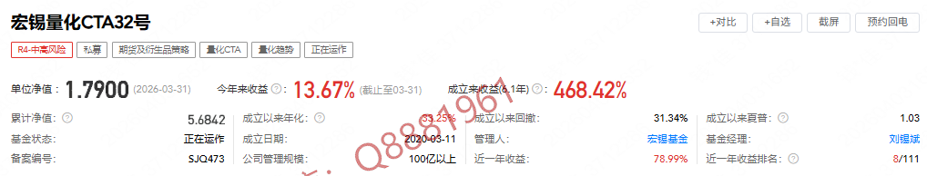 该产品为CTA策略型R4中高风险的私募基金产品,其单位净值为1.7900,今年以来的收益为13.67%,成立以来的收益为468.42%,成立以来的回撤为31.39%,通过图片可以观察到该只私募基金产品成立以来的收益走势图。专注量化私募、中证 500/1000 指增,长期跟踪、客观分析,欢迎有需要的投资人加微信:Q8881961。