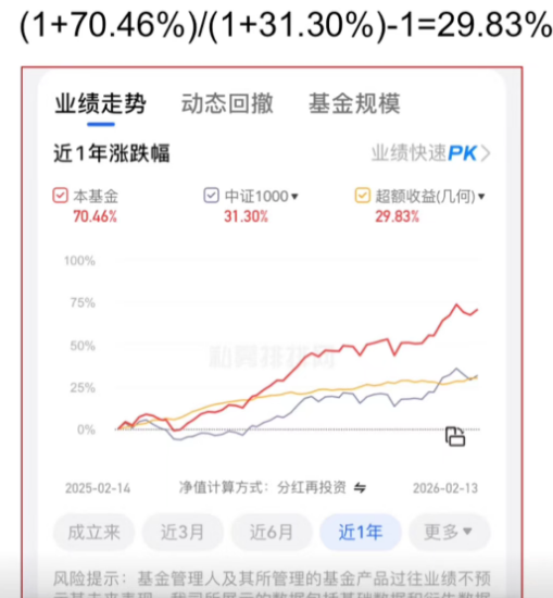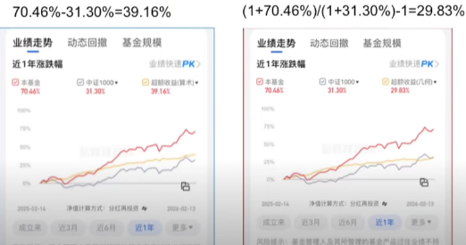 示例:指数收益 31.30%、基金收益 70.46%,几何超额收益 = (1+70.46%)÷(1+31.30%)-1 ≈ 29.83%,较算术法低约 10 个百分点。