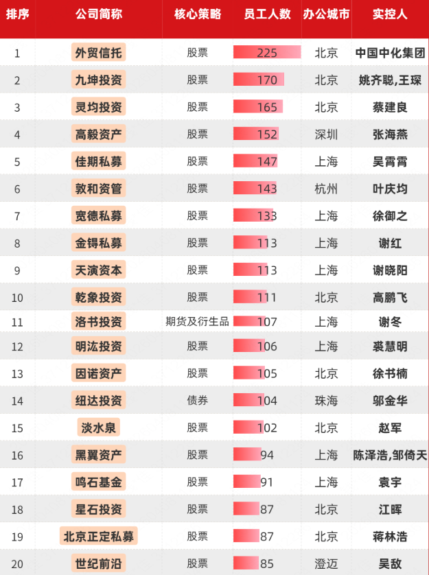 从员工人数来看,员工人数在100人以上的百亿私募有15家,其中,外贸信托、九坤投资、灵均投资、高毅资产的员工数均在150人以上。