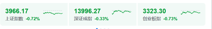 1.A股4月09日交易日指数表现A股三大股指上证指数 收报3966点,涨-0.72%深证指数 收报13996.27点,涨-0.33%创业板指 收报3323.30点,涨-0.73%代码名称昨收开盘最高最低今收涨幅%000001上证指数3995.003967.633979.133955.253966.17-0.72399001深证成指14042.5013928.4314058.0513891.4813
