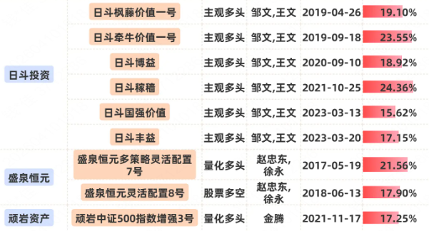 其中,来自百亿私募日斗投资的“绩优巨轮产品”占6只:“日斗枫藤价值一号”、“日斗牵牛价值一号”、“日斗博益”、“日斗稼穑”、“日斗国强价值”、“日斗丰益”,均由基金经理邹文和王文共管。
