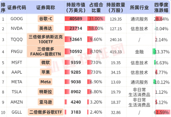 根据美国证交会网站的数据,2025年末东方港湾海外基金共持有10只美股标的,持股市值合计13.16亿美元。其中,前2大重仓股谷歌和英伟达占到投资组合的50%以上。