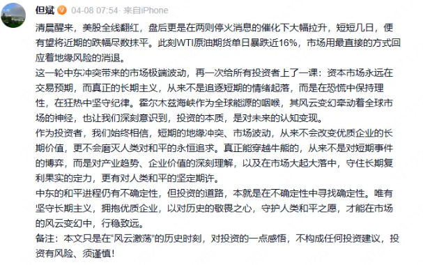 4月8日,中东停火谈判消息传来,全球资本市场大反弹。但斌再次发文感慨“这一轮中东冲突带来的市场极端波动,再一次给所有投资者上了一课:资本市场永远在交易预期,而真正的长期主义,从来不是追逐短期的情绪起落,而是在恐慌中保持理性,在狂热中坚守纪律。霍尔木兹海峡作为全球能源的咽喉,其风云变幻牵动着全球市场的神经,也让我们深刻意识到,投资的本质,是对未来的认知变现。