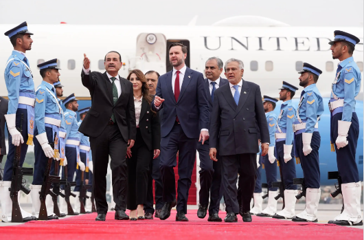周日,副总统万斯在伊斯兰堡会见了巴基斯坦和伊朗的代表后,抵达新闻发布会现场。照片由杰奎琳·马丁拍摄