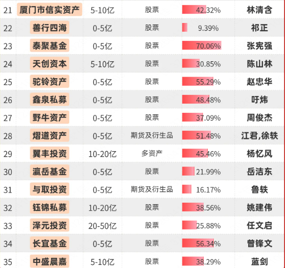 全部产品创新高的10亿元以上规模私募占12家,包括:沣京资本、孚盈投资、禾永投资、积露资产、积优基金、鲸域资产、蓝宝石基金、翼丰投资、钰锦私募、泽元投资。