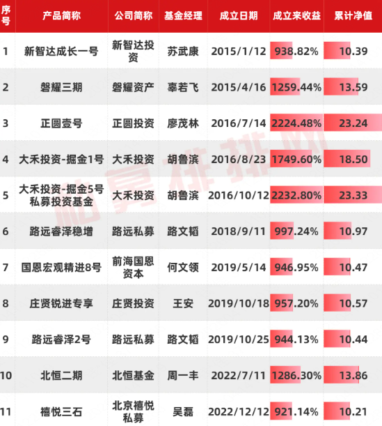 值得关注的是,最快达成“十元基”的是北京禧悦私募吴磊管理的“禧悦三石”,累计净值为10.21,该产品成立于2022年12月,成立以来收益达924.14%,用时仅3年多一点。