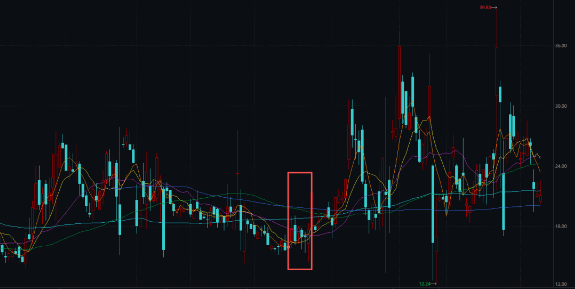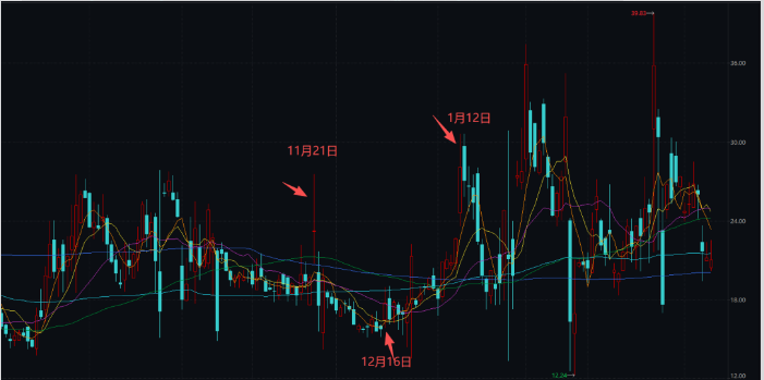 同样经历了三个阶段,初期调整的阶段,波动率上升并不明显,在震荡阶段下跌非常明显,波动率来到了极值低位附近(18一线),伴随着标的持续连阳,市场情绪得到爆发,在1月12日单日大幅上涨22.60%。