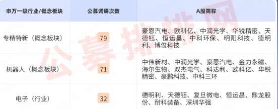公募机构调研方向含科量高,从申万一级行业来看,电子成为上周被调研A股数量最多的行业,该行业中有7只个股受到公募机构调研关注,分别是德明利、天德钰、复旦微电、恒运昌、鼎龙股份、耐科装备、深圳华强,合计被调研次数达32次。从概念板块来看,机器人和专精特新概念则最受公募机构调研青睐,其中机器人概念被调研个股数量最多达11只,合计调研次数达71次。专精特新被调研次数最多达79次,被调研个股数量为10只。其中中伟新材、中润光学、豪恩汽电等机器人概念股和德明利、中润光学、豪恩汽电、中科环保等专精特新概念股均获得不少于10家公募机构调研关注。此外,中润光学、豪恩汽电、欧科亿和华锐精密成为同时具备机器人和专精特新双重概念个股。头部私募基金长期跟踪,帮你分析市场、根据行情配置产品,欢迎添加微信:Q8881961。