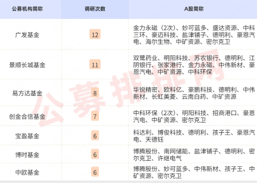 广发基金上周调研11只A股达12次,其调研个股中,有色金属行业个股数量最多达4只,分别是金力永磁、盛达资源、中科三环和中矿资源,其中金力永磁被调研达2次。紧随其后的是景顺长城基金,上周调研11只A股达11次,其中银行业个股数量最多达3只,分别是苏农银行、江阴银行和张家港行。头部私募基金长期跟踪,帮你分析市场、根据行情配置产品,欢迎添加微信:Q8881961。