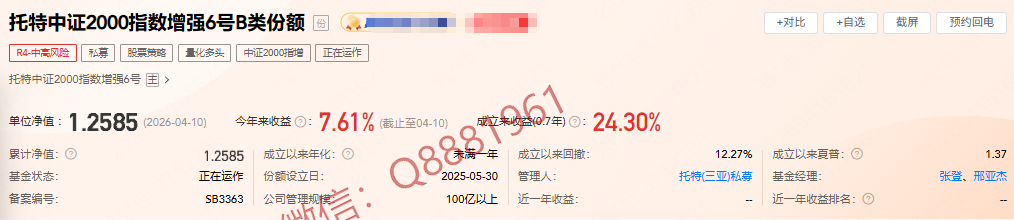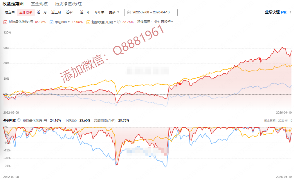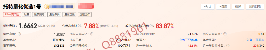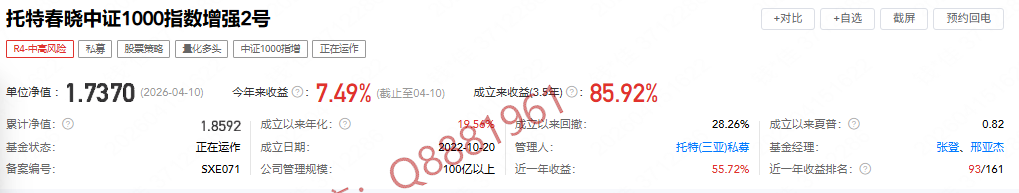 该只私募基金产品为R4中高风险,今年以来的收益为7.49%,成立3.5年以来的收益为85.92%,其中我们来看一下具体数据,成立以来的夏普比为0.82,成立以来的回撤为28.26%,单位净值为1.7370,通过图片,可以观察到这支基金产品的基金规模,截止到2026/4/10的累计净值为1.8470。诚邀进百人私募投资群,深度解析私募策略与收益,百万起投可加微信Q8881961详聊。