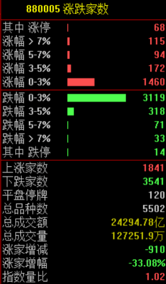 两市共1841只个股上涨,68只个股涨停,3541只个股下跌。