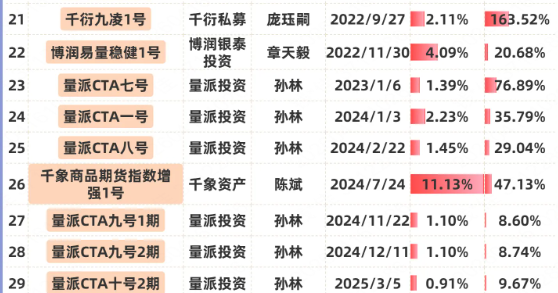 产品角度来看,百亿私募旗下40只量化CTA产品中,有29只产品在3月份实现正收益,正收益占比为72.50%。宏锡基金旗下多达13只量化CTA产品在列,其中刘锡斌管理的“宏锡量化CTA32号”3月份实现收益5.85%,该产品成立以来收益为468.42%。组建优质百人私募群,专注私募策略研究、收益复盘,百万起投朋友私信微信Q8881961。