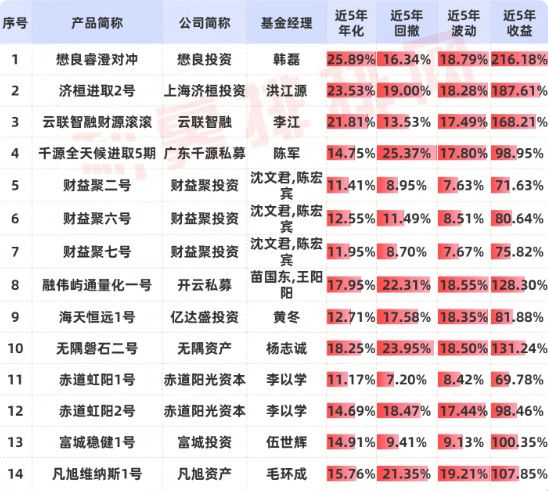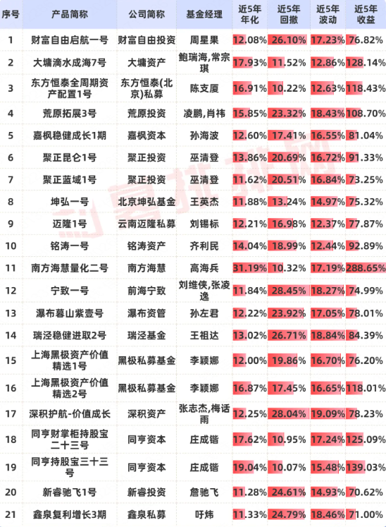 黑极私募基金、同亨资本、聚正投资均各有两只产品在列。同亨资本庄成锴管理的“同亨持股宝三十三号”近5年收益为139.03%,近5年年化、回撤、波动表现分别为19.04%、10.07%、15.48%,表现较为亮眼。组建优质百人私募群,专注私募策略研究、收益复盘,百万起投朋友私信微信Q8881961。