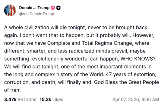 复活节后的星期二,他发出了总统任期内最引人注目的最后通牒,称除非伊朗在 12 小时内达成协议,否则整个文明将会灭亡。