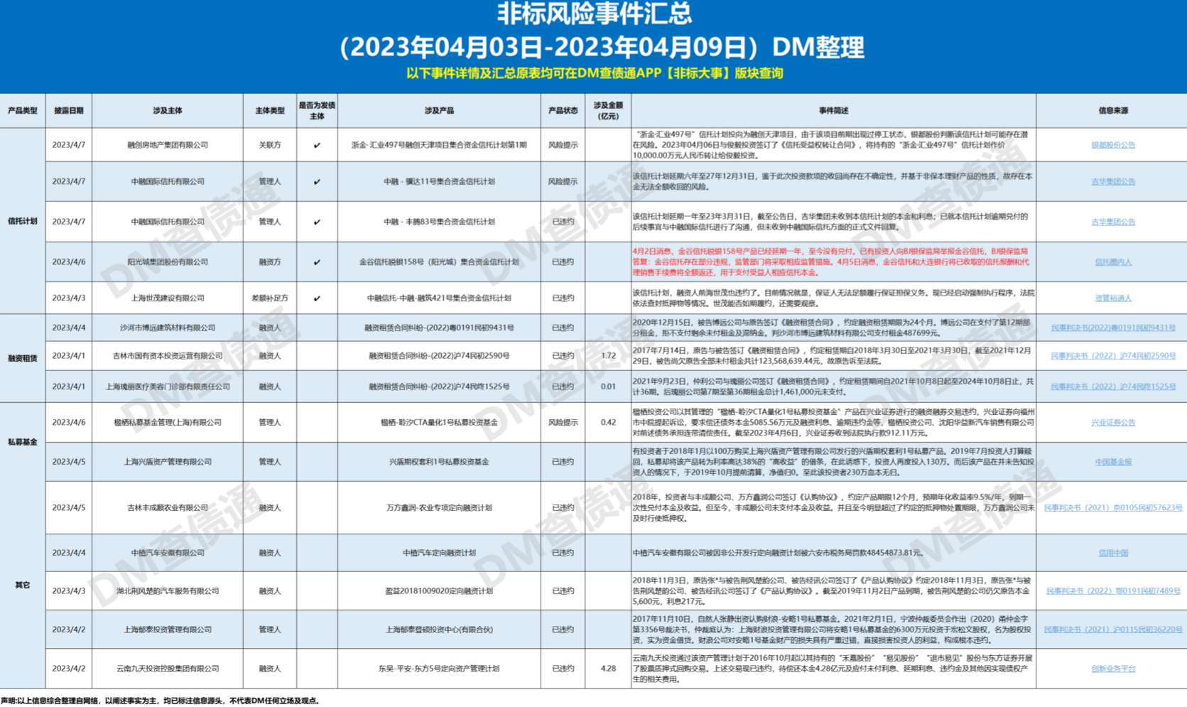 日期产品名称非标资产类型非标资产风险类型融资人担保人事件概要2020/1/2中融-助金80号集合资金信托计划信托计划非标资产违约深圳盛世建金股权投资合伙企业(有限合伙)本信托计划通过深圳盛世建金股权投资合伙企业(有限合伙)持有新疆同济堂健康产业股份有限公司股票。2020/1/2安信·安赢15号·重庆两江未来城股权投资集合资金信托计划信托计划非标资产违约重庆结美亚置业有限公司本信托计划受让重庆逸合实