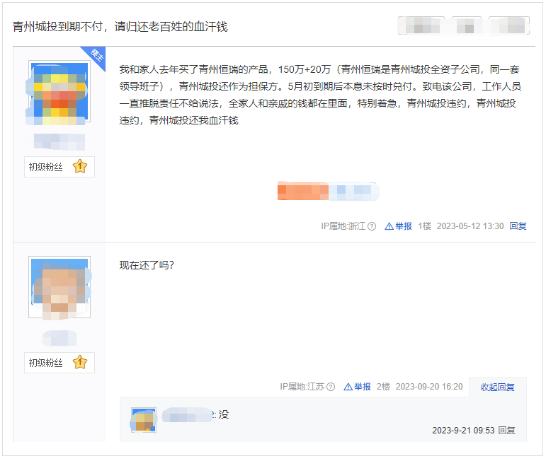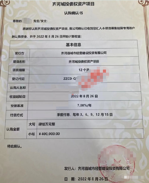 据投资人反馈称,高密富民融资定融产品持续违约,到期不支付本金,持续拖欠本金绝不支付。问相关工作人员答复:“公司没钱,你的情况我们向上反应”,然后没后文了。希望相关部门出门解决该问题。据另一个投资人回复称,昨天(10月7日)去支取,说是六个月付本金,但很可能没有利息,然后签明放弃利息才能取本金。现在定融确实大面积违约,不仅高密,潍坊,青州,聊城,齐河,现在均在陆陆续续爆出,付本金不付利息,付利息不付