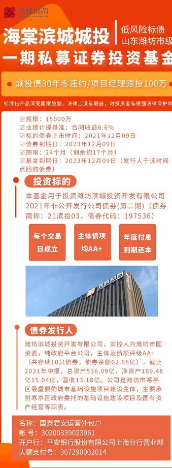 山东潍坊市地级市城投非网红区域债券定投基金!!项目经理跟投100万!!债券发行人主体及债项评级为AA+!每个交易日申购成立!城投债全市场至今30年零违约记录,安全性远高于非标类产品!该基金已在中国证券投资基金业协会完成备案!受证监会监管!标准化产品深受国家鼓励,法律上没有瑕疵,对投资者有很强法律保护作用!【基金名称】滨城城投一期私募证券投资基金规模:15000万业绩计提基准:合同收益6.6%/年。