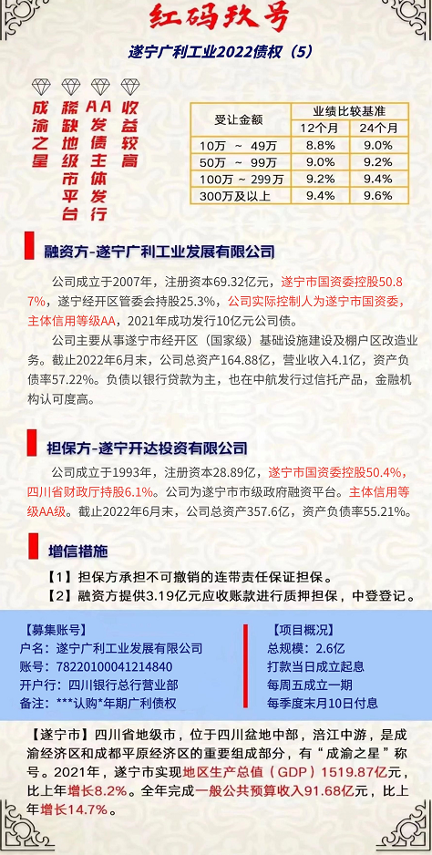 成渝之星,绿色遂宁 遂宁市国资委控股融资平台 国家级经开区唯一工业投资平台 AA发债平台发行 AA发债地级市平台担保 足额应收账款质押并登记 该笔融资报主管部门批准【红码9号-遂宁广利工业发展有限公司2022债权(5)】【总规模】不超过2.6亿,本期3500万元。【期限】12/24个月【收益兑付】季度付息,季度末月10日【成立