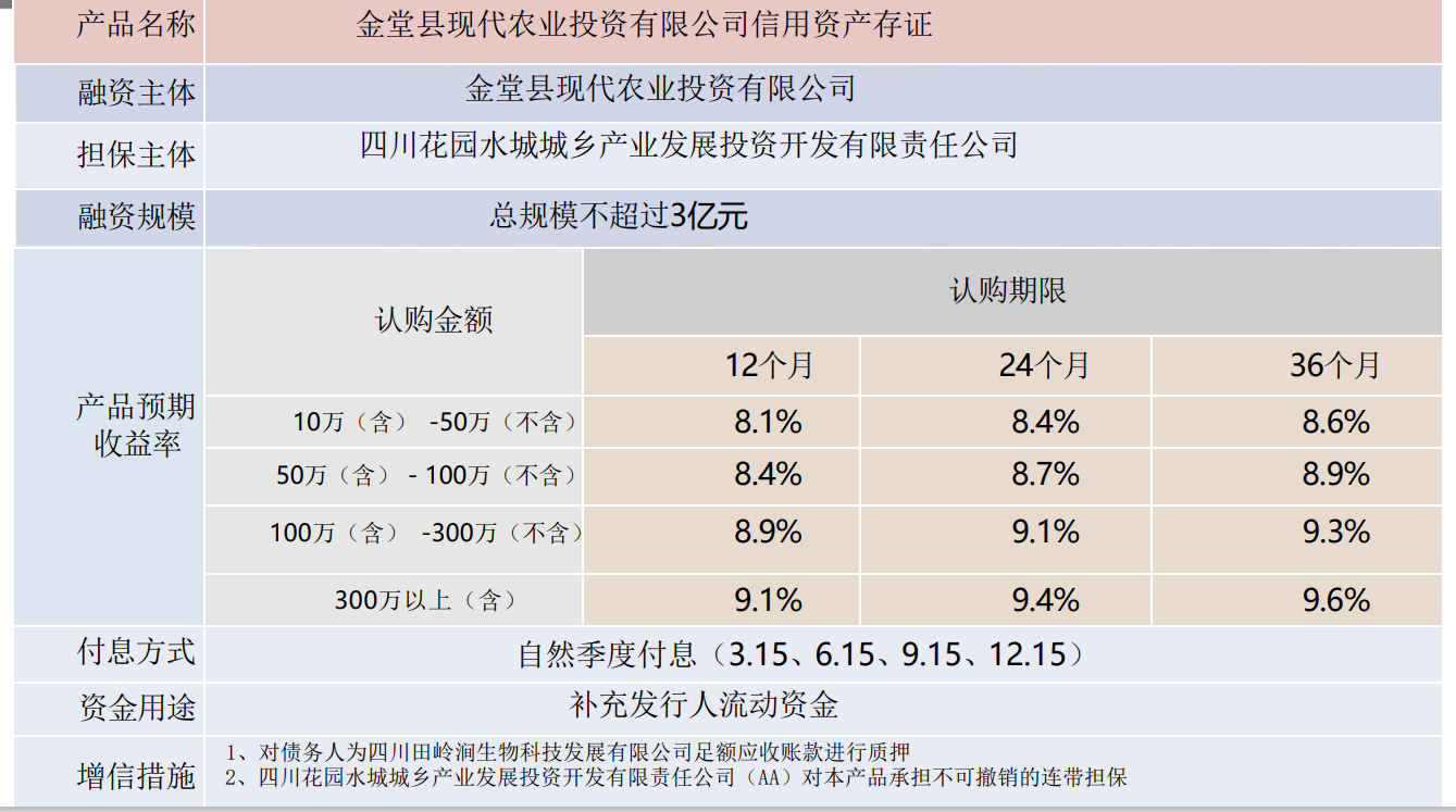 新一线省会城市政信项目:AA主体融资+AA主体担保+足额应收账款质押+38.6亿一般财政预算收入【金堂县现代农业投资有限公司信用资产存证】【规模】:3亿 期限:12个月/24个月/36个月【付息方式】自然季度付息(季度末15号)【预期收益】12个月:10万-50万-100万-300万:8.1%-8.4%-8.9%-9.1%24个月:10万-50万-100万-300万:8.4%-8.7%-9.1%-