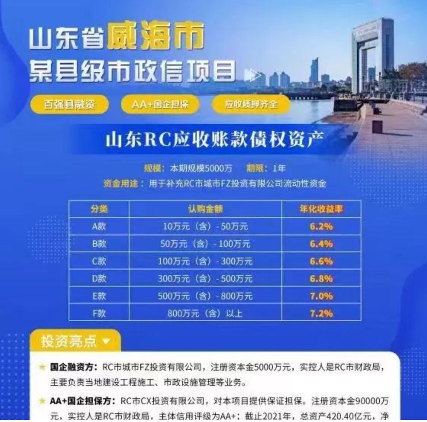 政信定融区域1、山东【山东RC应收账款债权资产】【项目亮点】1、全国百强县市首发优质产品,29位。2、RC市财政局控股平台,主要负责当地市政基建。2、山东【昌邑市城投债权收益权资产计划】【项目亮点】1、昌邑市重点项目,市区配套设施基础建设。2、地方财政局直属城投平台,首次市场发行。3、当地最大城投平台担保,多倍应收账款质押,土地抵押!3、山东【寿光海发2022债权项目】【项目亮点】1、百强县-全国