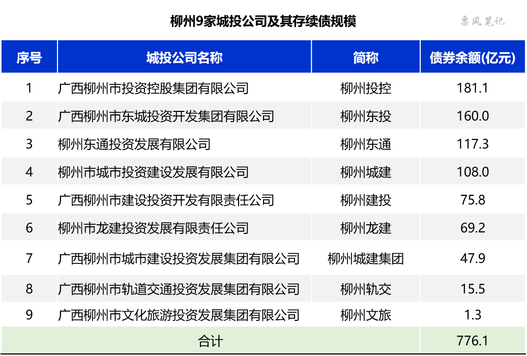 柳州城投商票逾期观察数据显示,目前柳州市有存续债的城投公司共有9家,截至2023年5月末,存续债余额合计776.1亿元,9家城投公司及其存续债规模具体如下:自2022年12月以来,柳州市已有5家城投公司被交易商协会进行自律处分,分别是柳州东通、柳州投控、柳州龙建、柳州轨交、柳州东投,交易商协会在这么短的时间之内处分同一个地级市的五家城投公司,实属罕见。二、柳州城投商票逾期分析截至2023年5月末,
