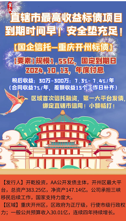 衡昇20号,直辖市最高收益标债项目,没有之一!债券到期日比较早!安全垫充足![太阳]重庆开州,三峡库区主要移民区,战略地位重,国家补贴力度大!区域首次信托融资,第一大平台发债,绑定直辖市信用!小额畅打!【山西信托—重庆开州标债】【要素】规模1.55亿,固定到期日2024.10.13,年度付息税后收益:30万-300万:7.3%- 7.4%/年(合同收益7%/年,差额收益后补)【资金用途】用于投资重