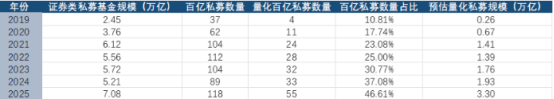 我们把证券类私募的规模也拉出来做一个计算,假设量化私募在百亿私募中的数量占比,代表了量化私募在证券类私募的规模占比。