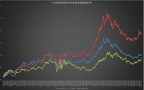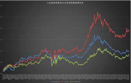 可以看到主动股基指数对比各指数在2021年8前一直能做出超额。尤其是以2019-2021年这两年多最为明显,随后又一蹶不振。
