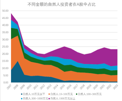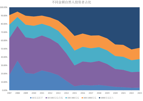 我们计算了从07年到23年历年不同金额的自然人投资者在自然人投资者中的占比,发现了一个很有意思的现象。