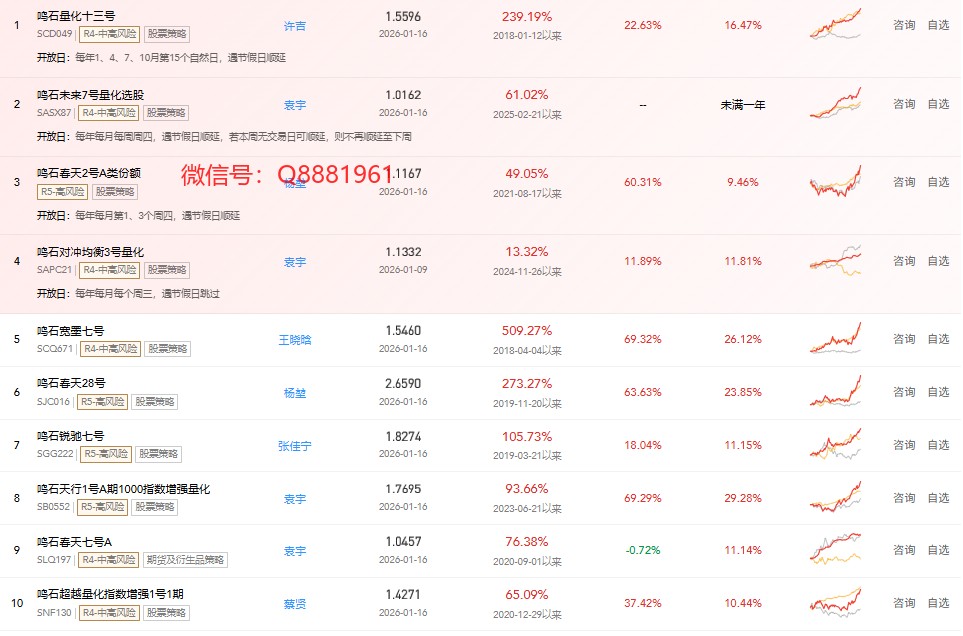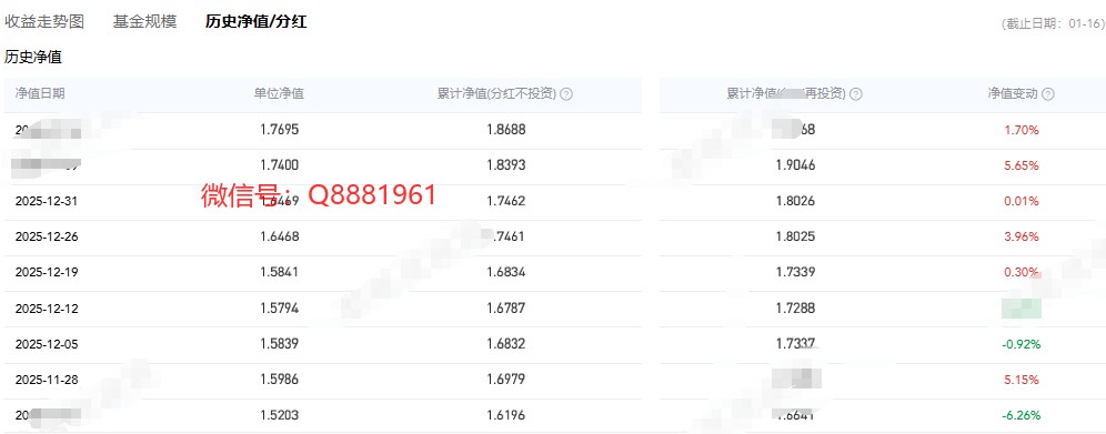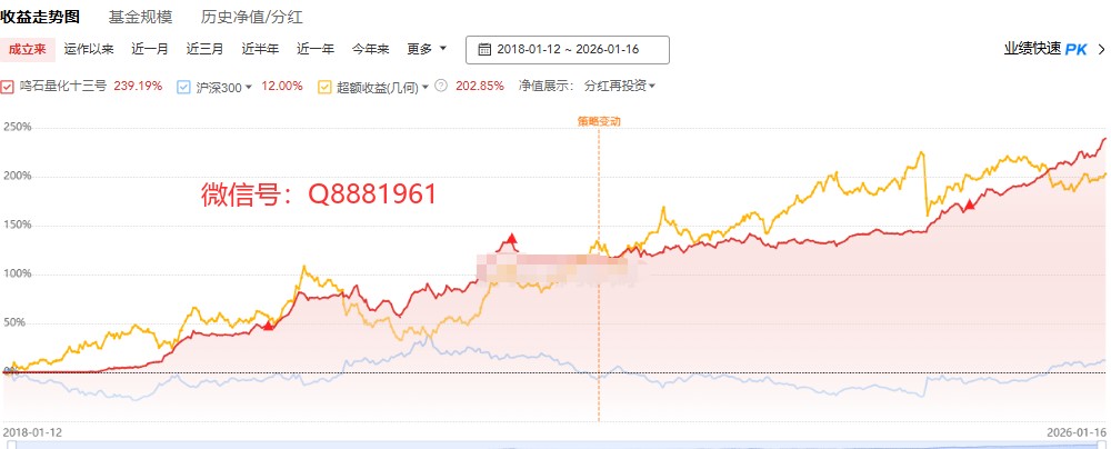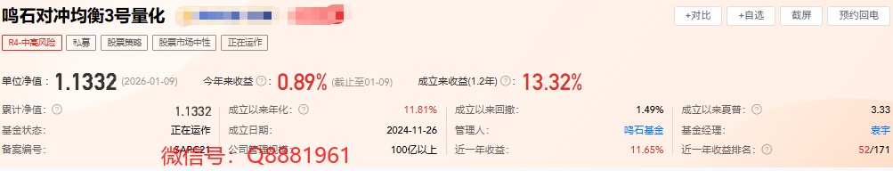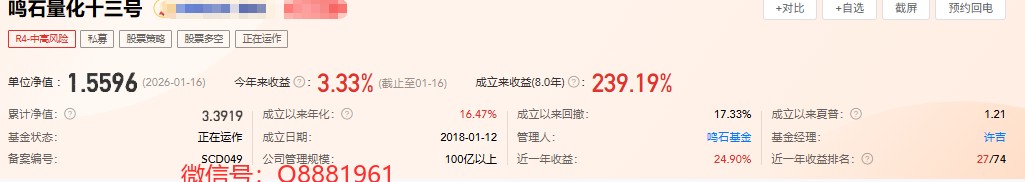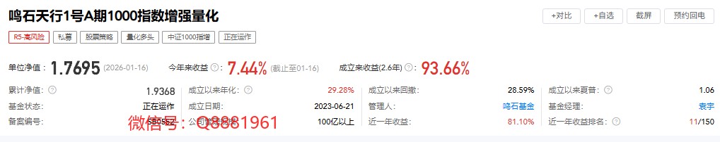 该只私募基金产品为R5高风险,今年以来的收益为7.44%,成立2.6年以来的收益为93.66%,其中我们来看一下具体数据,成立以来的夏普比为1.06,成立以来的回撤为28.59%,单位净值为1.7695,通过图片,可以观察到这支基金产品的基金规模,截止到2026/1/16的累计净值为1.8688亿元。想追踪最新的基金信息,微信扫描文章下方二维码了解更多信息,加我微信不迷路。