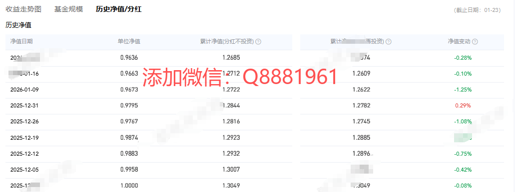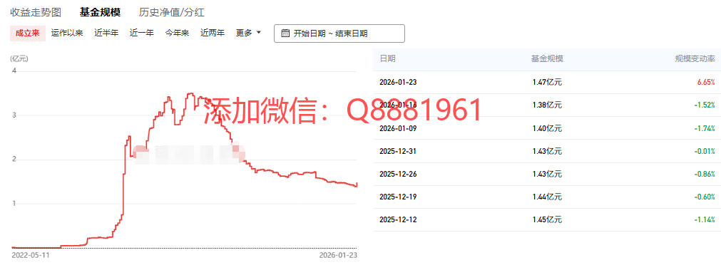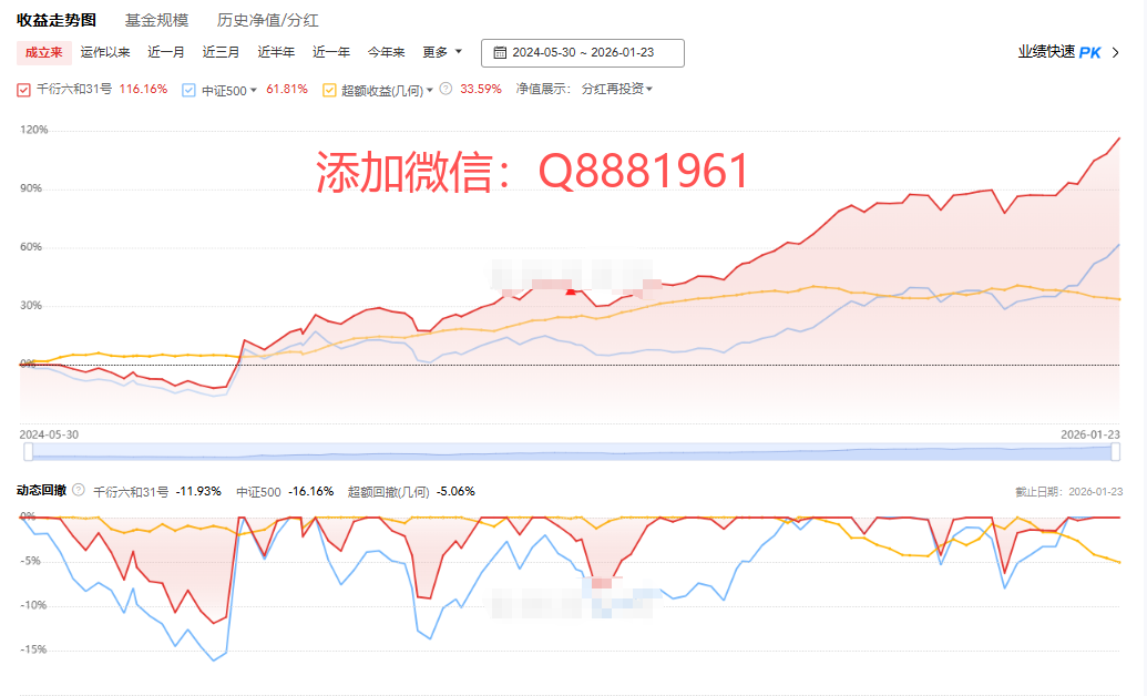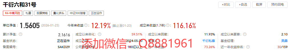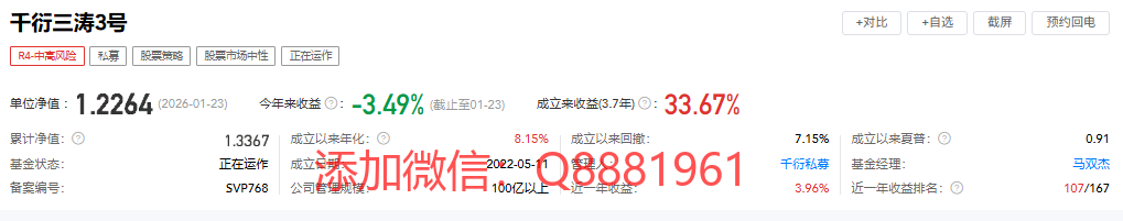 该只私募基金产品为R4中高风险,今年以来的收益为-1.62%,成立2.4年以来的收益为25.74%,其中我们来看一下具体数据,成立以来的夏普比为1.33,成立以来的回撤为7.39%,单位净值为0.9636,通过图片,可以观察到这支基金产品的基金规模,截止到2026/1/23的累计净值为1.2685。想追踪最新的基金信息,微信扫描文章下方二维码了解更多信息,加我微信不迷路。