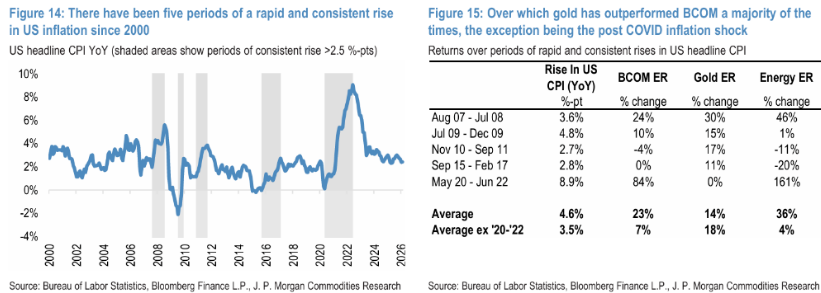 其一是通胀对冲价值。该行梳理了自2000年以来美国CPI快速持续上涨超过2.5个百分点的五个历史时期:除2020年至2022年疫情后通胀周期外,其余四个时期黄金均录得两位数涨幅,且均跑赢大宗商品综合指数(BCOM)。疫情后通胀系需求正向冲击与供应链受限叠加所致,大宗商品整体涨幅远超黄金,属特殊情形。摩根大通认为,若此次油价冲击演变为滞涨环境,黄金的通胀对冲价值将更加突出。