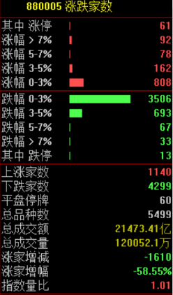 两市共1140只个股上涨,61只个股涨停,4299只个股下跌。
