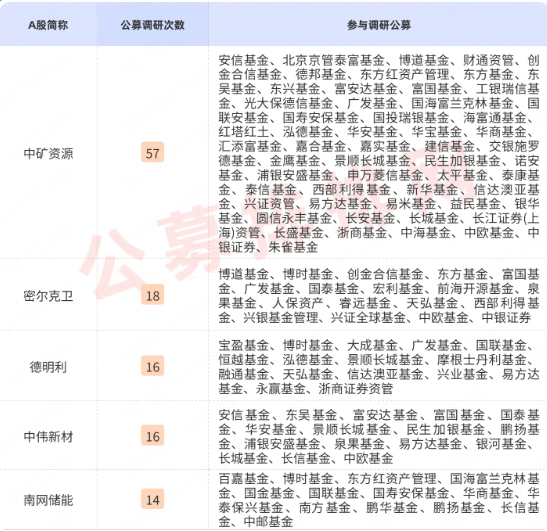其次是密尔克卫、德明利和中伟新材,虽然不及中矿资源受公募机构调研追捧,但参与调研的公募机构均不下15家。
