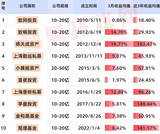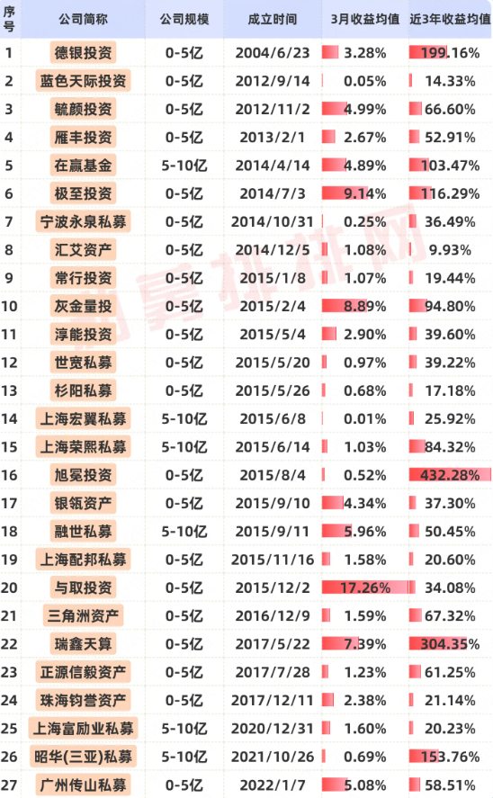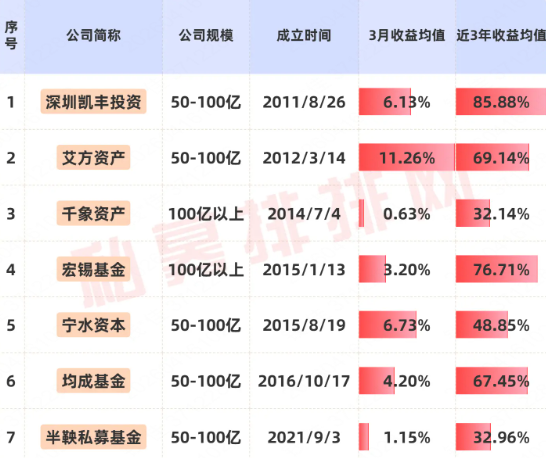公司维度来看,50亿以上私募中,宁水资本、宏锡基金、艾方资产等旗下CTA策略产品,在3月份的收益均值分别为6.73%、3.20%、11.26%,近3年收益为48.85%、76.71%、69.14%。其中,艾方资产蒋锴和谢艺冰“艾方CTA一号”3月收益均值达11.42%,表现较为亮眼,该产品近3年收益为69.62%。组建优质百人私募群,专注私募策略研究、收益复盘,百万起投朋友私信微信Q8881961。