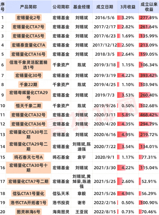 产品角度来看,百亿私募旗下40只量化CTA产品中,有29只产品在3月份实现正收益,正收益占比为72.50%。宏锡基金旗下多达13只量化CTA产品在列,其中刘锡斌管理的“宏锡量化CTA32号”3月份实现收益5.85%,该产品成立以来收益为468.42%。组建优质百人私募群,专注私募策略研究、收益复盘,百万起投朋友私信微信Q8881961。