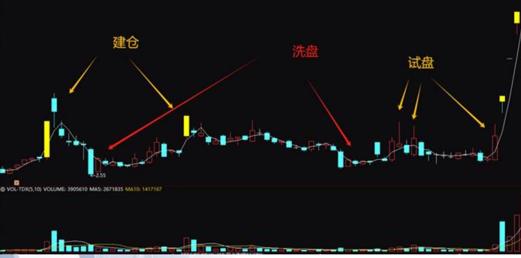 主力在低位悄悄买股票,把筹码吃到手。股价不怎么涨、也不怎么跌,横盘磨人,成交量慢慢变大,但盘面很安静。主力目的:越低越买,攒够筹码,准备拉升。