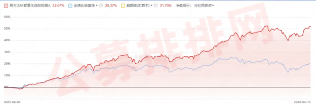 2025年6月4日成立,截至2026年4月15日,易方达科智量化选股股票A收益52.07%,同期业绩比较基准收益率20.37%,超额收益31.70%。自成立以来基金跑赢业绩基准,能在近期轮动市中做出亮眼的超额,是一匹量化赛道的低调黑马。