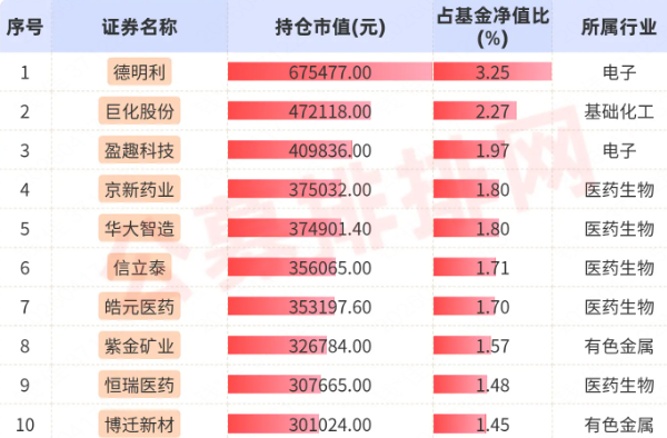 从2025年3季度末的十大重仓股来看,基金主要投在德明利、巨化股份、盈趣科技、京新药业、华大智造、信立泰、皓元医药、紫金矿业、恒瑞医药、博迁新材。