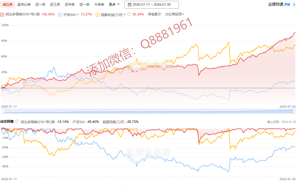 该只私募基金产品为R5高风险,今年以来的收益为5.25%,成立9.6年以来的收益为387.06%,其中我们来看一下具体数据,成立以来的夏普比为0.93,成立以来的回撤为24.76%,单位净值为4.8706,通过图片,可以观察到这支基金产品的基金规模,截止到2026/1/30的累计净值为4.8706。想追踪最新的基金信息,微信扫描文章下方二维码了解更多信息,加我微信不迷路。