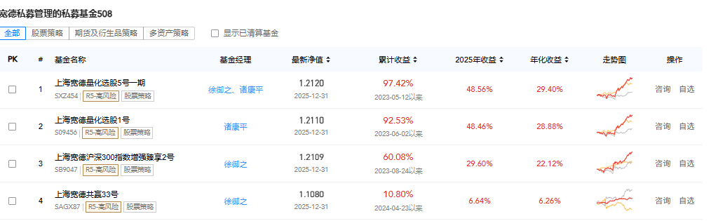 2.产品类型:发行了宽德优优中证 1000 指数增强系列、宽德量化对冲系列等多只私募基金产品,覆盖不同风险收益偏好的投资者需求。