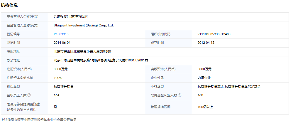 九坤投资(北京)有限公司是中国量化私募第一梯队机构,2012 年 4 月由王琛(清华计算机博士,曾任职千禧年管理)与姚齐聪(北大金融数学硕士)创立,2014 年 6 月在基金业协会登记为私募证券投资基金管理人(登记编号 P1003313),核心定位是 “以量化挖掘规律、还原价值的科技公司”,长期深耕量化投资,管理规模超 600 亿元(截至 2025 年二季度),连续多年蝉联私募金牛奖,素有 “北九坤” 之称。九坤投资投资团队于2010年开始进行国内期货、证券的量化投资,并于2012年正式成立投资公司,是国内最早开始从事专业量化交易、高频交易的团队之一。现公司已获得证券投资私募资格。公司专注于股票、期货市场的量化交易和高频交易。
