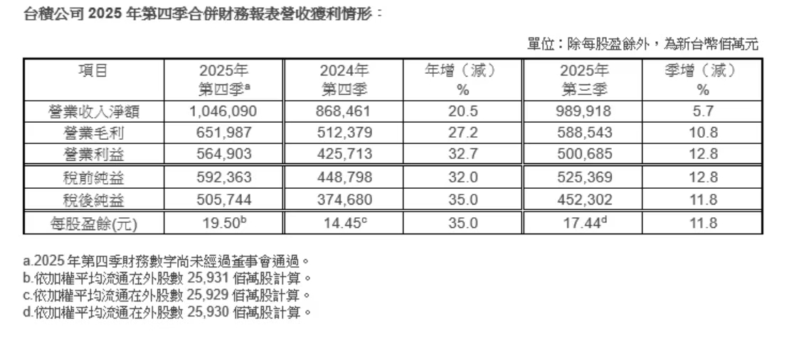 周四,台积电(TSM.N)公布2025年第四季度业绩,单季净利润实现5057亿新台币(约合160亿美元),同比增长约35%,不仅超出市场预期,还创下公司历史新高纪录。 该季度营收同样表现亮眼,约1.046万亿新台币,同比增长逾20%。这份成绩单展现出台积电在全球半导体供应链中的核心地位。 值得注意的是,该公司还实现了连续第七个季度净利润同比增长达到两位数的业绩延续。 这意味着自2024年以来,台积电每个财季都保持了至少10%以上的净利增速,反映出其产品组合与市场需求的结构性优势。 强劲的AI相关芯片需求、先进制程产能提升,以及主要客户在高性能计算领域的投入是推动业绩持续向上的关键因素。 特朗普的贸易政策以及对半导体产品加征关税的威胁,给全球芯片行业带来了极大的不确定性,不过这种不确定性尚未对因AI热潮而大幅增长的利润造成实质性损害。 分析人士指出,随着生成式AI、大模型及云服务应用的快速扩张,对先进逻辑芯片的需求显著增长, 而台积电凭借其3纳米及更先进技术节点产能优势,成为包括苹果与英伟达在内多家科技巨头的重要供货方。 这些高端制程芯片的出货提升,正在逐步改变公司营收结构,使得高毛利产品贡献持续上升。 该公司表示,3纳米制程出货占公司2025年第四季晶圆销售金额的28%,5纳米制程出货占全季晶圆销售金额的35%; 7纳米制程出货则占全季晶圆销售金额的14%。总体而言,先进制程(包含7纳米及更先进制程)的营收达到全季晶圆销售金额的77%。 另外,根据公司披露的数据,第四季度毛利率达到62.3%,同样高于市场预期,显示在高端产品比重增长的同时,成本控制与价格议价能力也有所增强。 近期,市场对台积电未来几个季度的预期普遍上调。 多家机构认为,随着2纳米制程技术逐步推进、AI服务器芯片订单增长,以及更多新产品导入生产线,台积电在2026年的营收与利润增长仍具备较强动力。 此外,该公司在美国与其他地区的晶圆厂扩建进程也将改善全球生产布局,但这也带来了资本支出增长与短期成本压力的变量。 |
