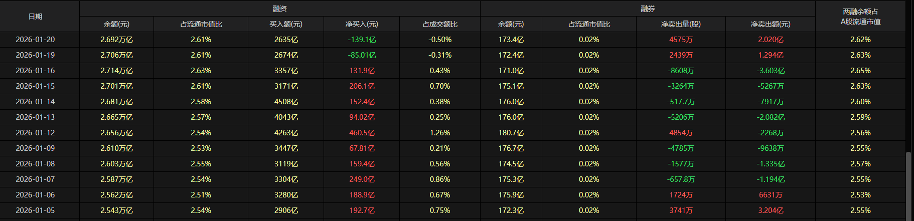 融资余额:1 月 14 日为 2681 万亿,1 月 20 日为 2692 万亿,整体保持平稳,说明政策主要影响的是新增融资买入,而非存量合约的平仓。
