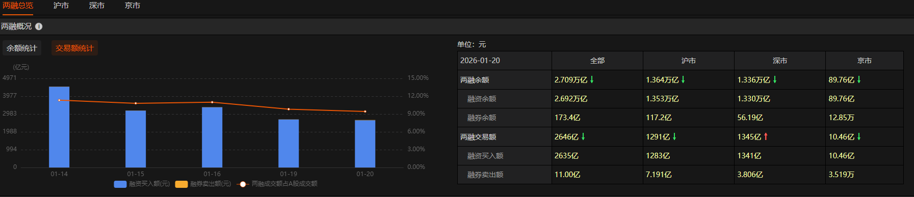1 月 19 日 - 20 日:两融交易额分别降至 2674 亿和 2646 亿,其中沪市、京市交易额均出现明显下滑,仅深市交易额略有回升。